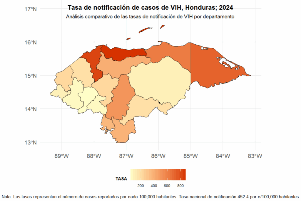 Con base en los datos brindados por la SESAL, los casos se distribuyen a lo largo del territorio nacional, concentrando alta carga de enfermedad en los departamentos de Gracias a Dios, Cortés, Atlántida, Islas de la Bahía y Francisco Morazán principalmente.